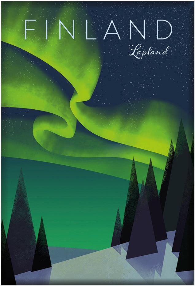 I created my Finland travel poster as an assignment for a class and wanted to recreate the feelings of majesty and awe that I found in the rich colors of the wintry landcape and northern lights.