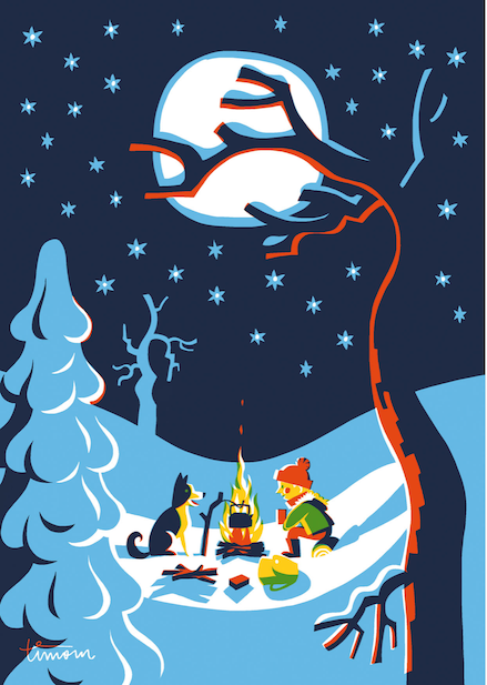 Nuotio (Campfire) postcard. Illustration by Timo Mänttäri. Kehvola Design Helsinki Finland. Printed in Finland on EU eco labelled paper.