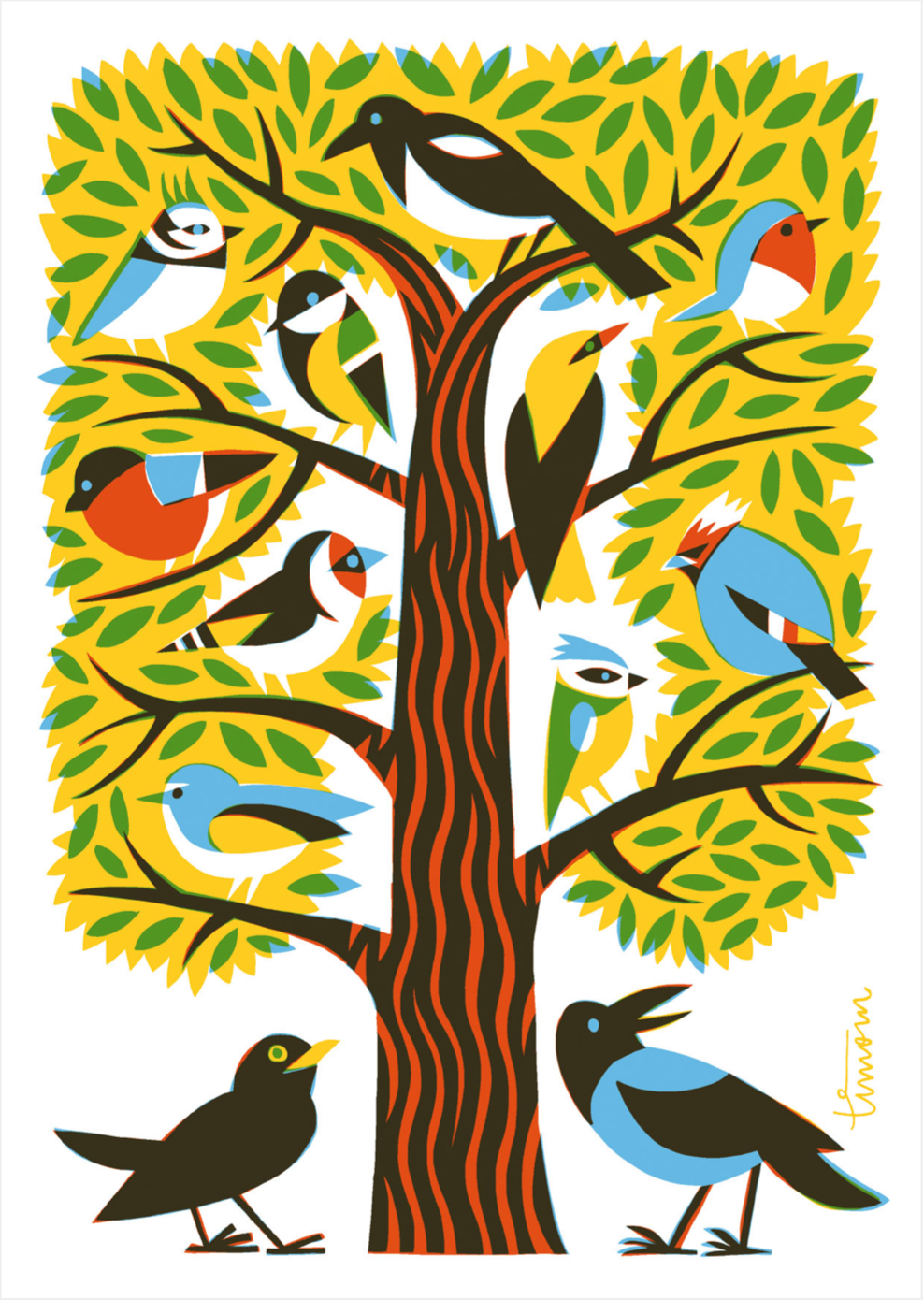 Linnut (birds), postcard. Illustration by Timo Mänttäri. Kehvola Design Helsinki Finland.