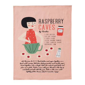A fun tea towel with raspberry caves (thumbprint cookie) recipe.